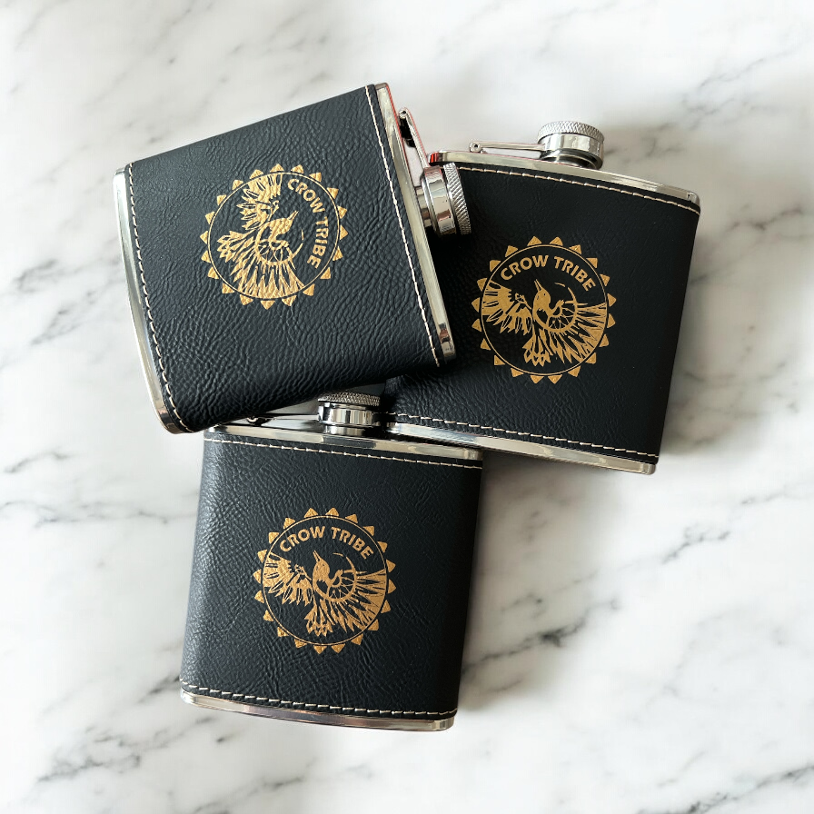 Stylish, practical, and fully customizable. This 6 oz stainless steel flask is wrapped in high-quality black leatherette, offering the look and feel of genuine leather with added durability. Your design is laser engraved in rich gold for a bold contrast—perfect for names, monograms, logos, or special messages.